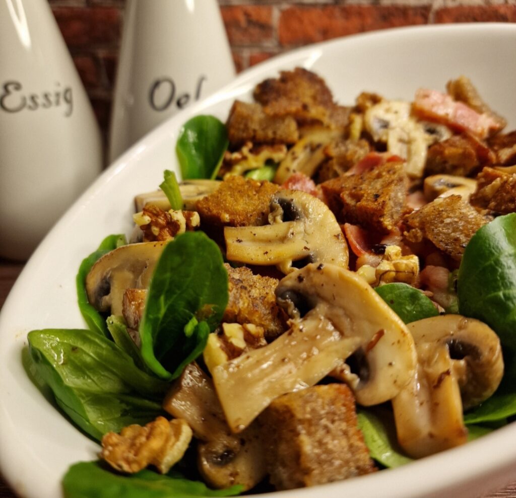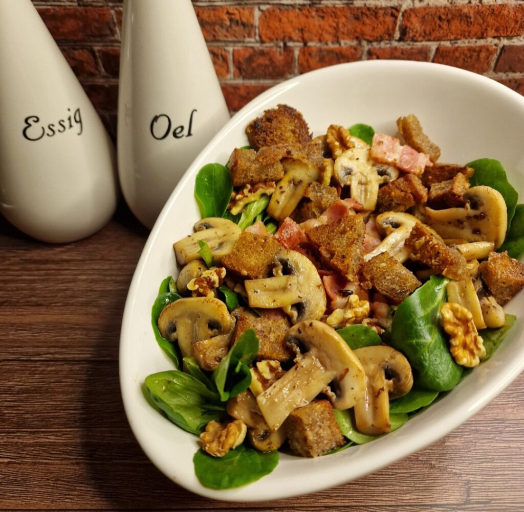 Wenn die Tage kürzer und die Temperaturen kühler werden, beginnt die Zeit für herzhafte, aber dennoch frische Salate. Der Nüsslisalat ist zart nussig im Geschmack und vollgepackt mit Vitaminen. So ist  er in den Herbst- und Wintermonaten ein echter Klassiker. In dieser Variante kommt er ohne Ei aus und wird stattdessen begleitet von gebratenem Speck, aromatischen Champignons, knusprigen Croutons und gehackten Walnüssen. Eine einfache Salatsauce rundet das Ganze ab, ohne den feinen Aromen die Show zu stehlen.
