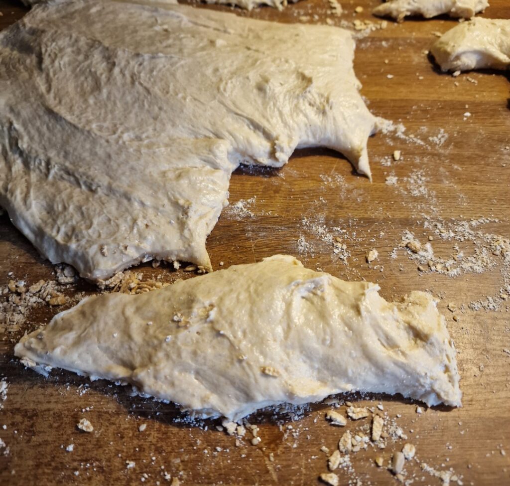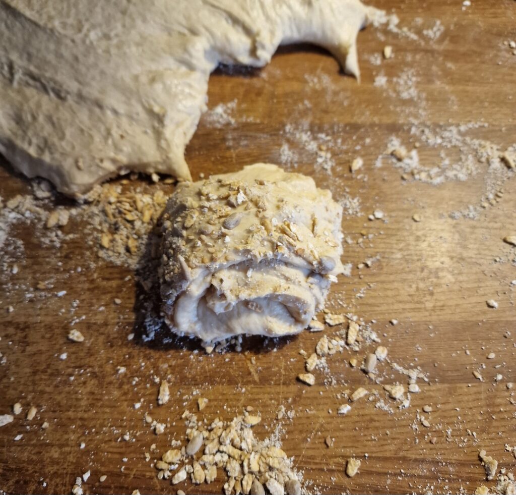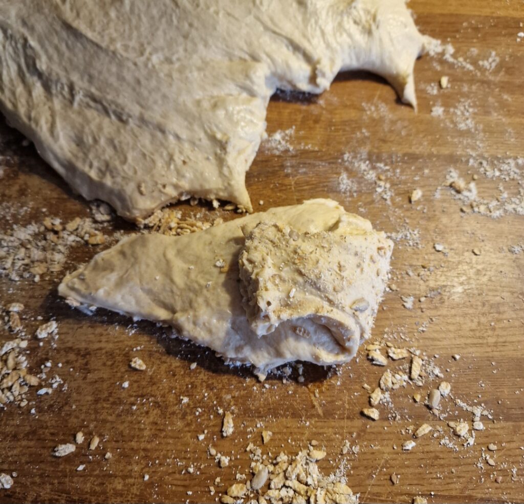 Die Saaten und Flocken auf der Arbeitsfläche verteilen und den Teig daraufgeben. Dann den Teig in 9 etwa gleichgrosse Stücke teilen.