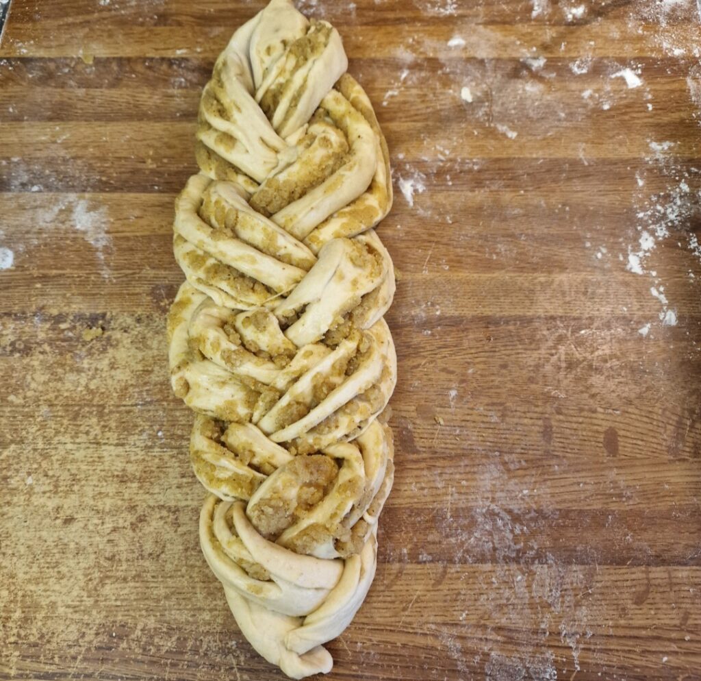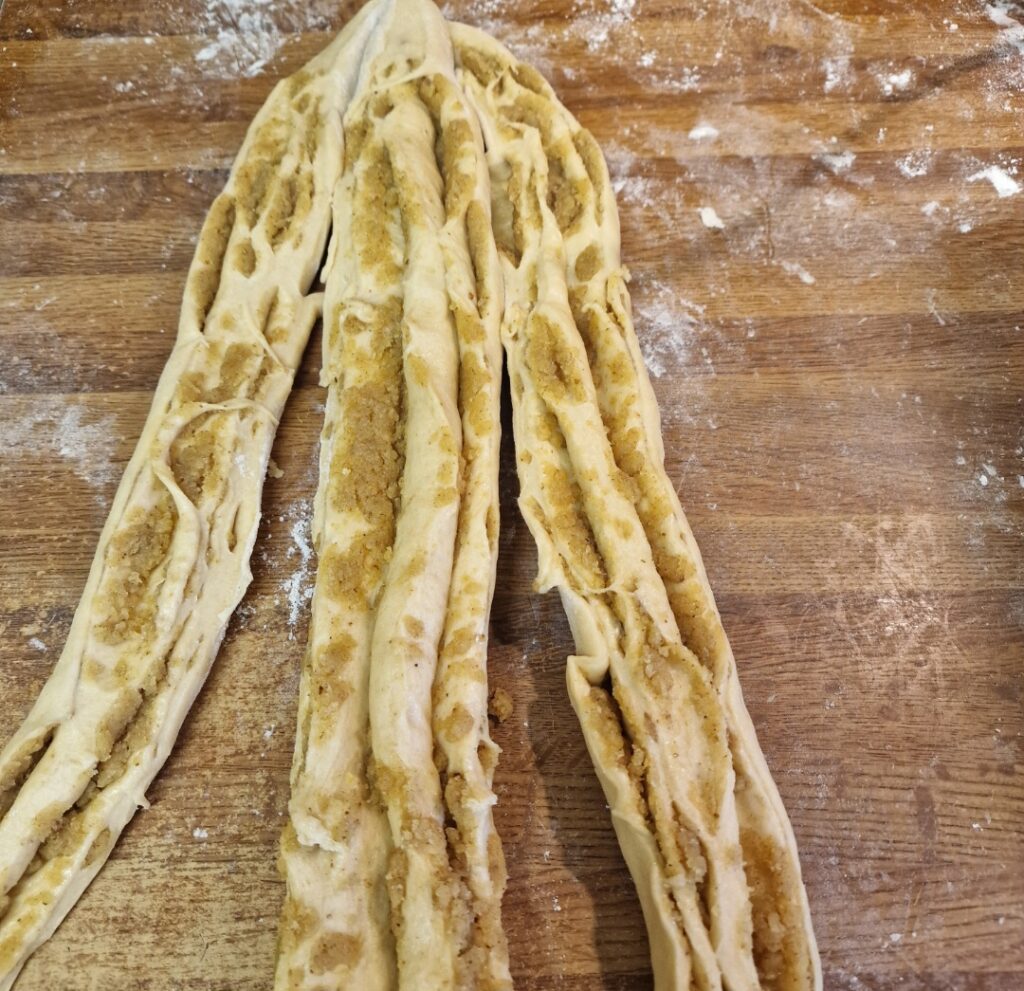 Den Teig und die Masse aus dem Kühlschrank nehmen und 1 Stunde aklimatisieren lassen. Danach den Teig auf einer bemehlten Arbeitsfläche zu einem Rechteck von etwa 45×35 Zentimeter ausrollen. Die Masse möglichscht gleichmässig darauf verteilen und von der Seite her zu einer Rolle aufrollen. Die Rolle dann längs in etwa 3 gleich dicke Teile teilen