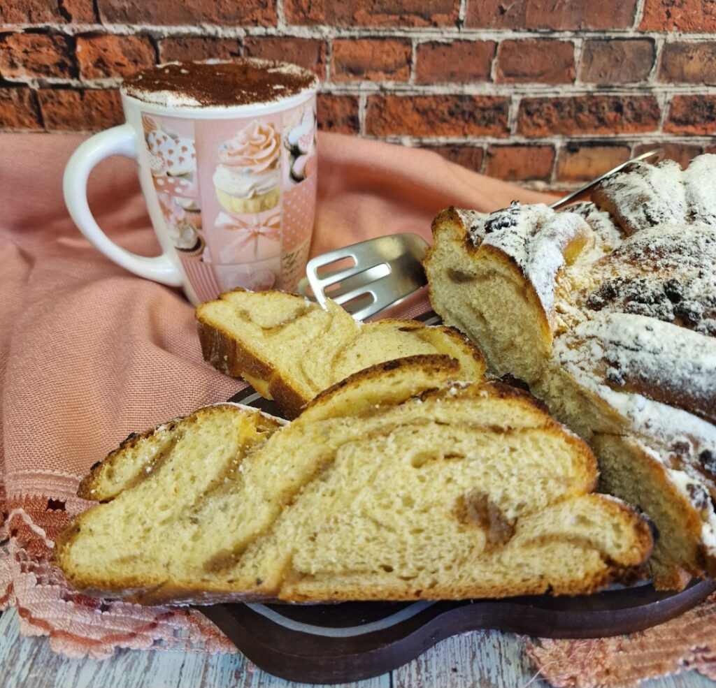 Rechtzeitig den Backofen auf 200 Grad vorheizen. Wenn der Ofen die Temperatur erreicht hat, das Blech in den Ofen schieben und den Zopf 30 Minuten bei 200 Grad backen. Danach auf einem Kuchengitter auskühlen lassen und kurz vor dem Servieren mit Puderzucker bestäuben.