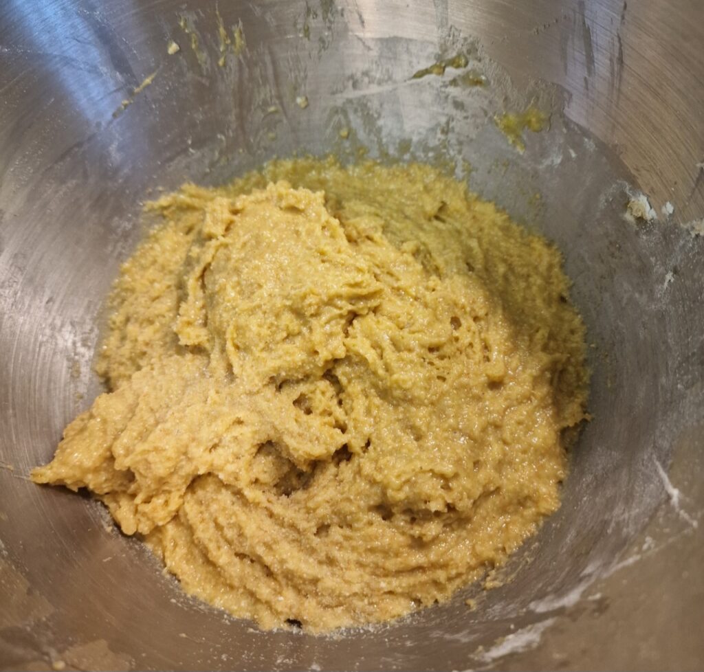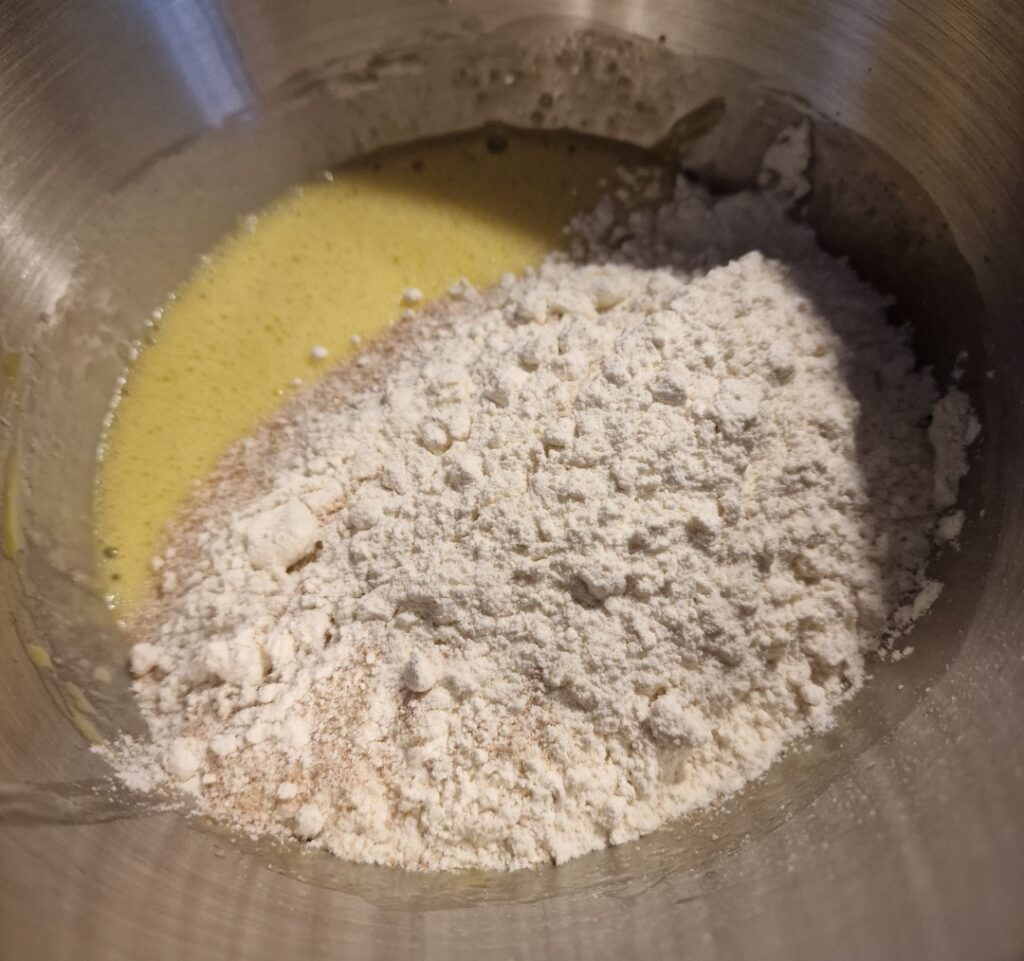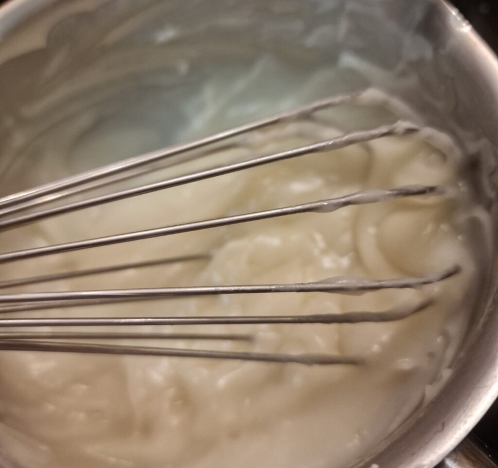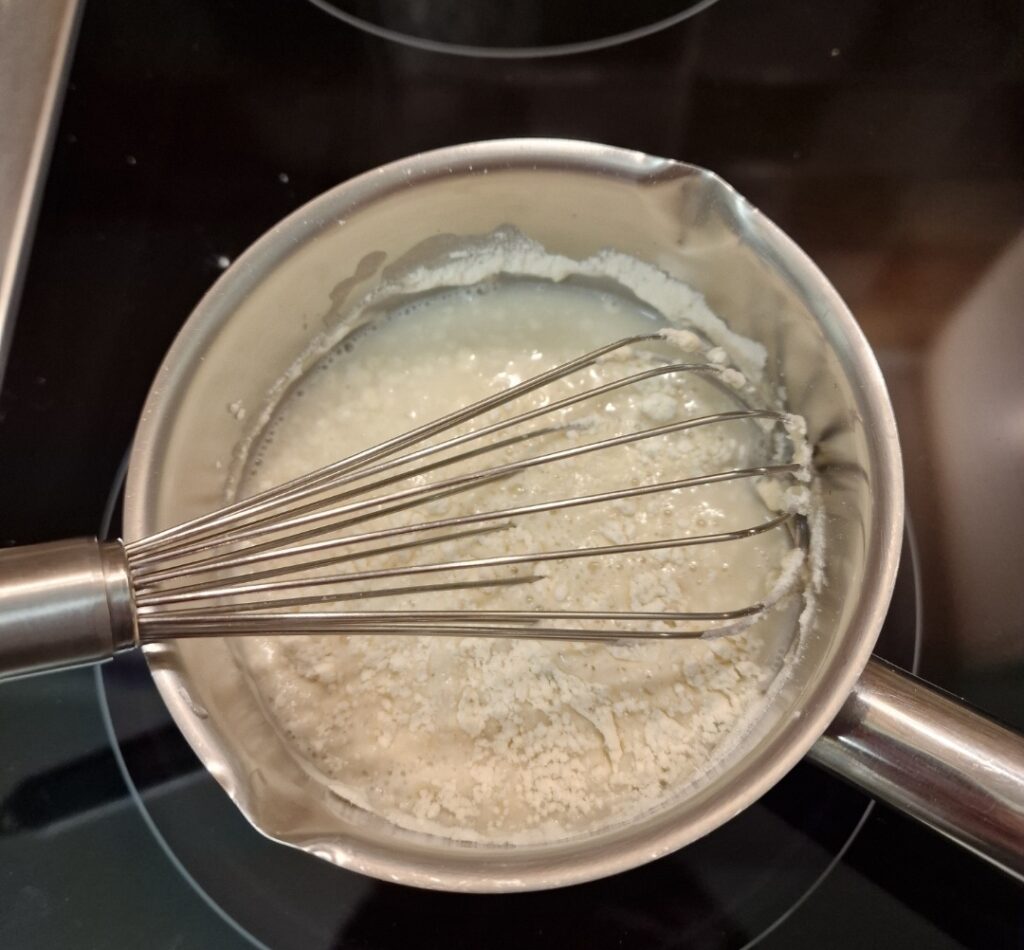 Wie fast immer konnten wir wählen ob wir mit einer Übernachtgare oder einer Direktgare backen wollten. Meine Idee wäre ja gewesen den Teig und die Füllung zu machen und dann über Nacht auf den kühlen Balkon zu stellen. Das hat nicht geklappt weil wir hier Minusgrade hatten. Wie so oft war nämlich der Kühlschrank zu voll um noch eine Schüssel mit Teig und eine Schüssel mit der Füllung reinzustellen. Es gibt ja noch Plan B, und der war ich mache das Mehlkochstück am Vorabend und stelle das nach dem Abkühlen abgedeckt in den Kühlschrank. Ein kleines Plätzchen hat sich dafür noch gefunden. Ein Mehlkochstück, auch Tangzhong genannt, verbessert die Textur und die Frischhaltung. Das Gebäck bekommt eine weichere Kruste und eine fluffigere Krume.