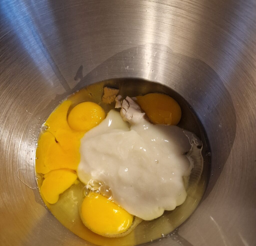 Die Eier, Eigelb, Tangzhong, Zucker und Hefe in eine Knetschüssel geben