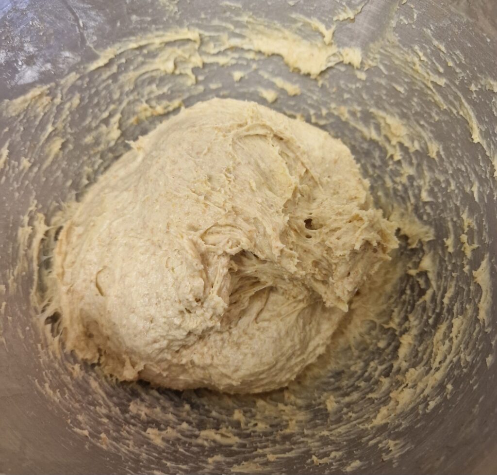 und mit dem Knethaken solange auf kleiner Stufe vermischen bis keine Mehlnester mehr zu sehen sind. Das ganze abgedeckt 20 Minuten ruhen lassen.