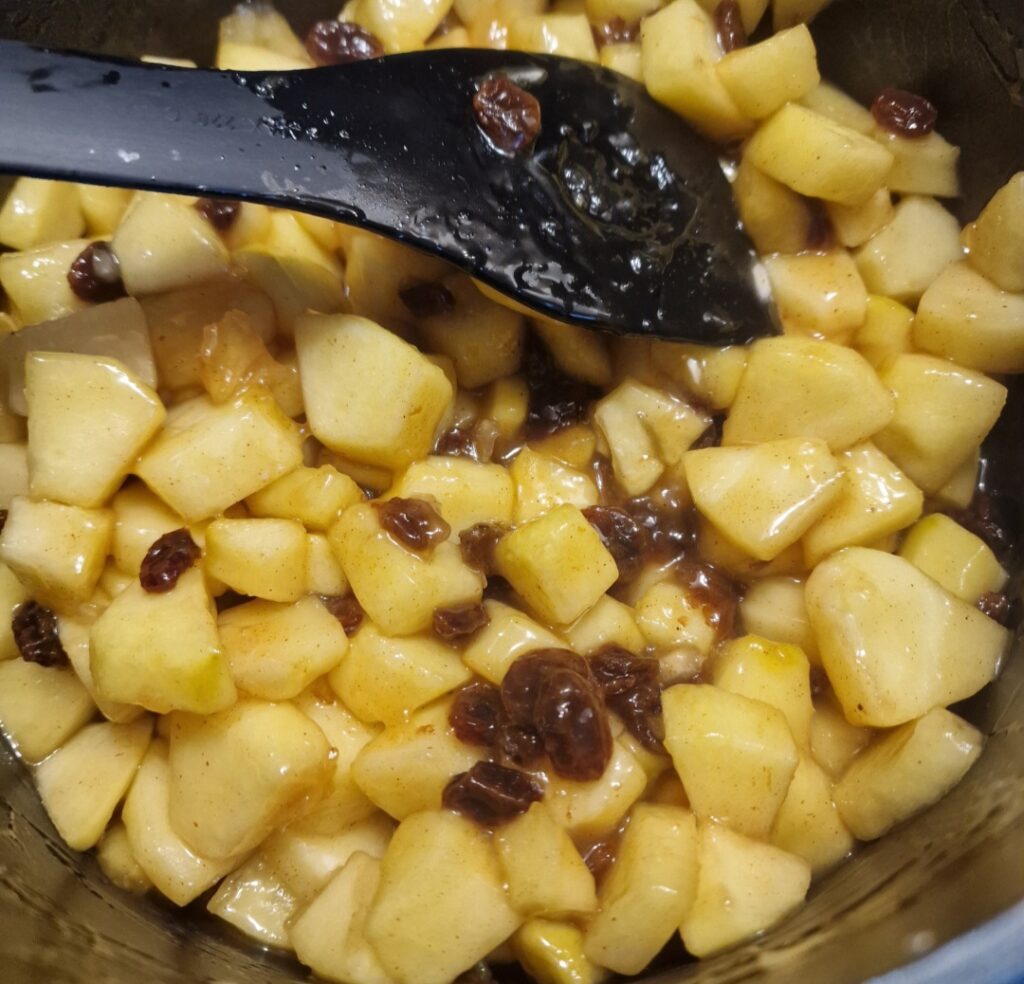 und unter regelmässigem rühren bei mittlerer Hitze köcheln lassen bis die Äpfel fast weich sind. Dann in einer kleinen Schüssel die Speisestärke und das Wasser vermischen und in die Pfanne zu den Äpfeln geben. Unter ständigem rühren köcheln lassen bis die Apfelfüllung eindickt.