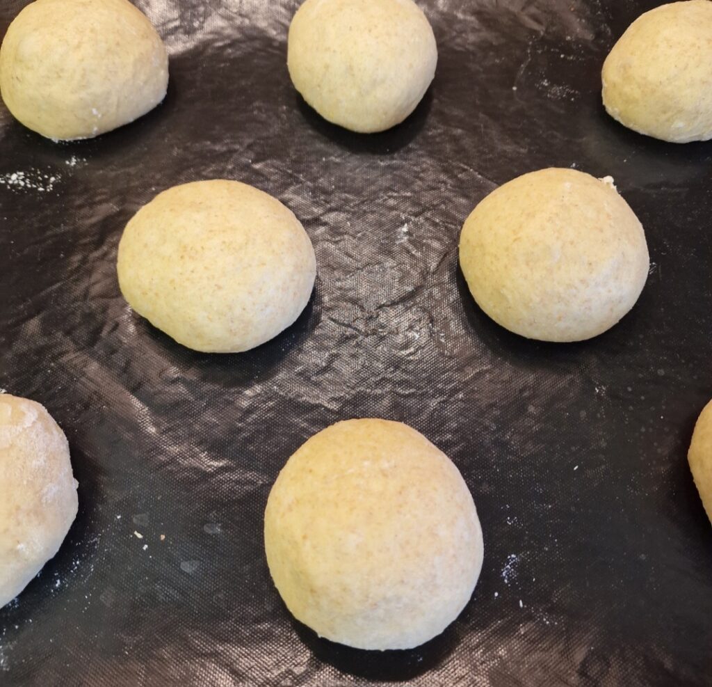 Den Teig in 8 Teile a zirka 100 g teilen, locker rundschleifen und auf einem mit einer Backmatte ausgelegten Blech abgedeckt 60 Minuten gehen lassen.