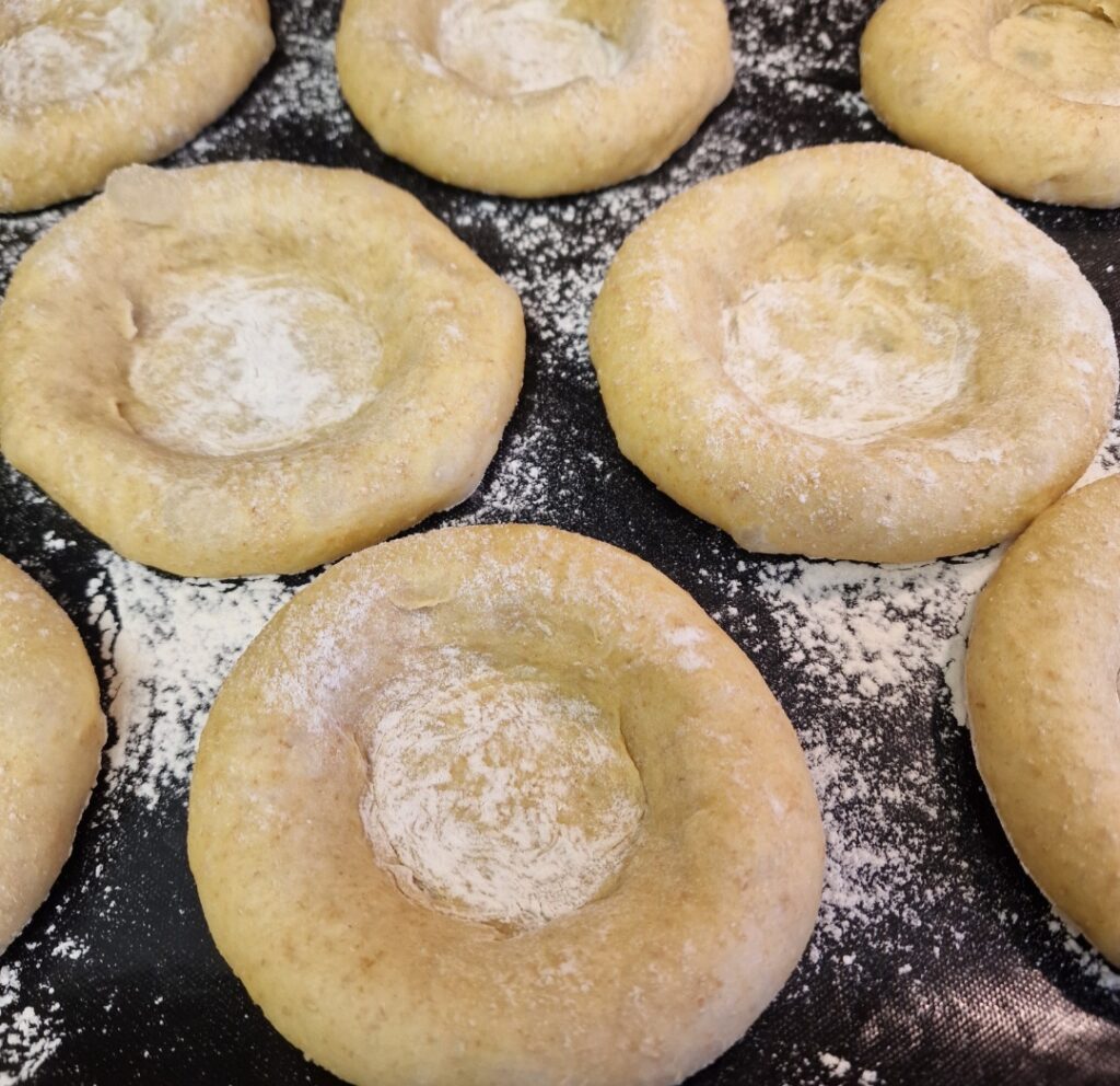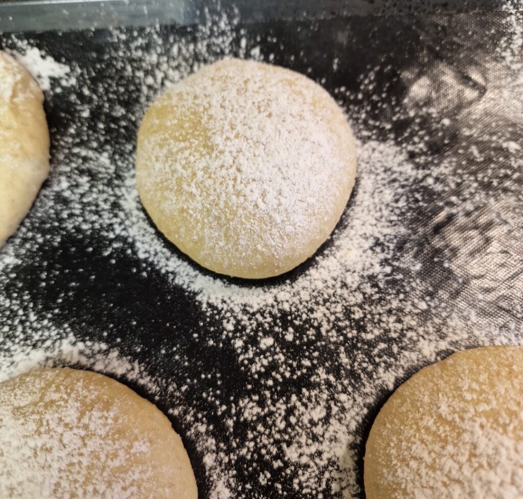 Den Backofen auf 180 Grad vorheizen. In dieser Zeit die Teiglinge leicht mit Mehl bestäuben