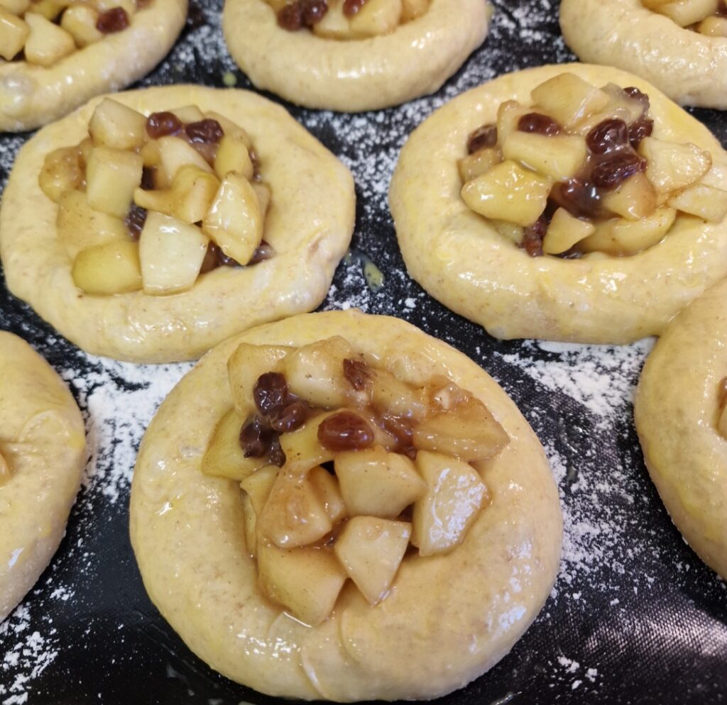 Die Ränder 2x mit verquirltem Ei bepinseln, die Apfelfüllung in die Mulden verteilen