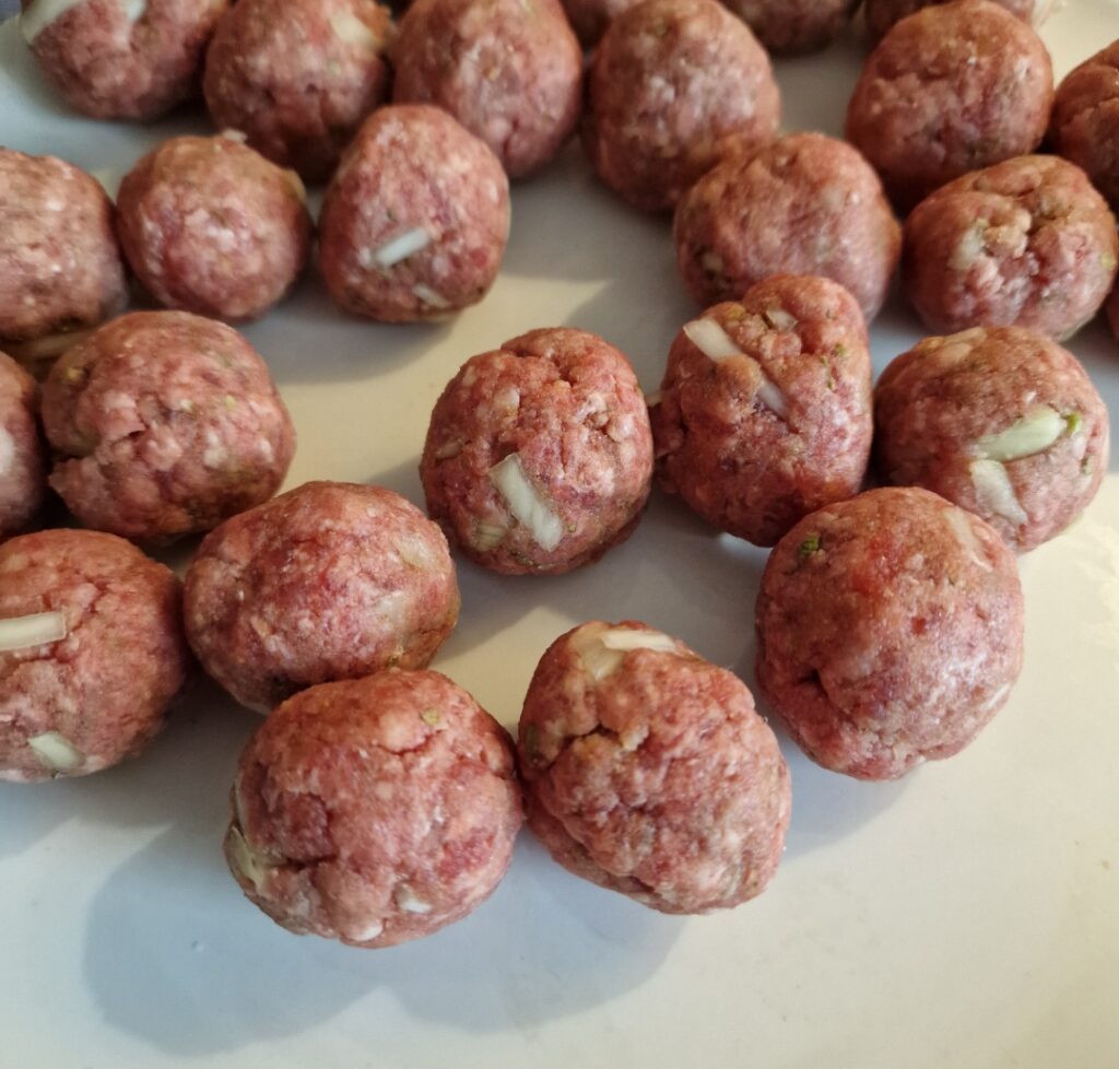 Die Zwiebel in kleine Würfel schneiden und mit den übrigen Zutaten für die Hackfleischmasse gut vermischen. Dann kleine Hackbällchen formen und bis zur weiteren Verwendung in den Kühlschrank stellen.