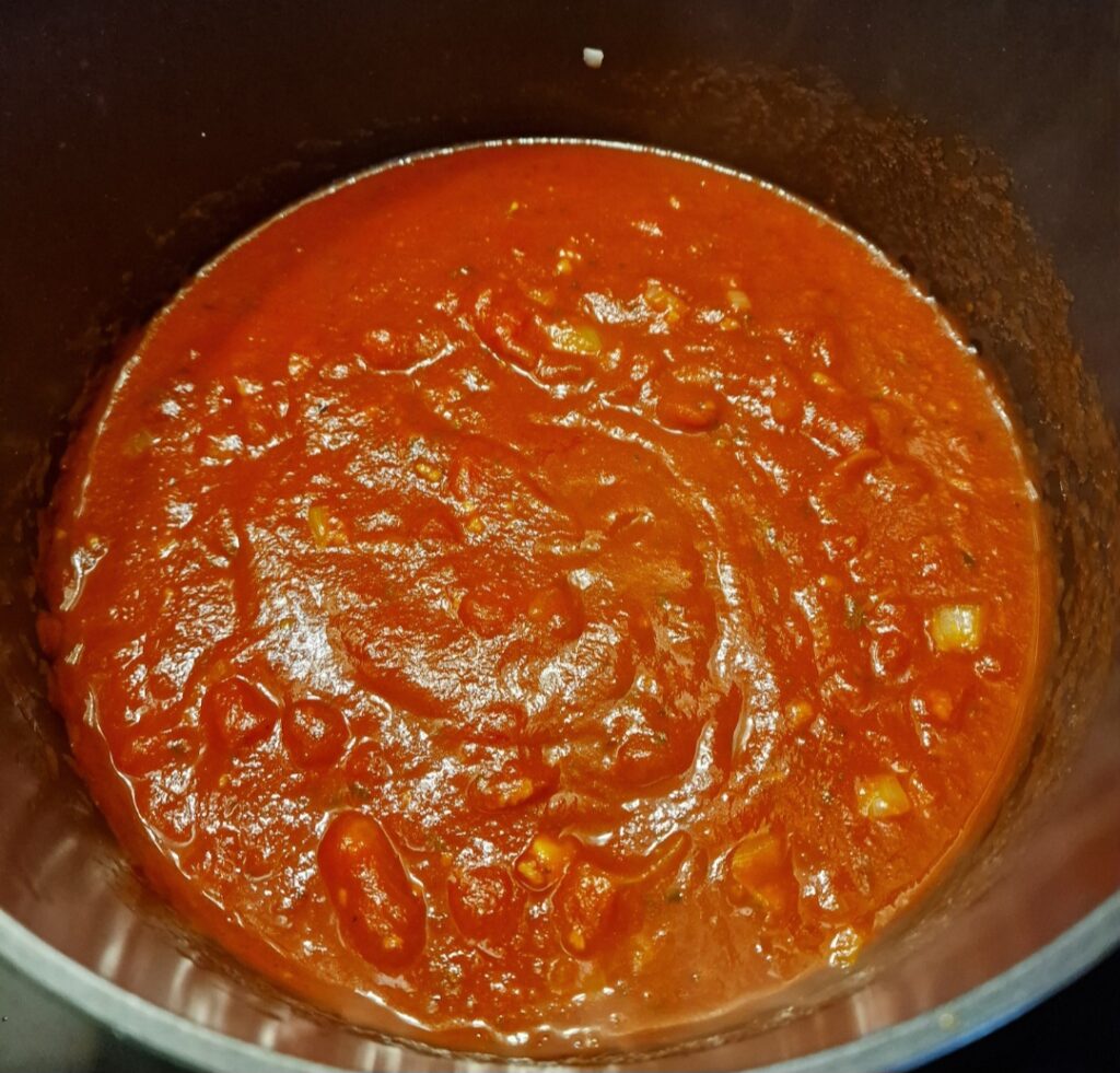 2 Esslöffel Olivenöl in einem grossen beschichteten Topf geben und heiss werden lassen. Die Zwiebel fein Würfeln und gut andünsten. Die Knoblauchzehe fein hacken und gegen Schluss dazugeben und kurz mitdünsten. Die gehackten Tomaten in den Topf geben, die Dose mit Wasser ausspülen und in den Topf geben. Das Tomatenmark dazugeben, mit Salz, Pfeffer und Oregano würzen und dann einmal aufkochen lassen.