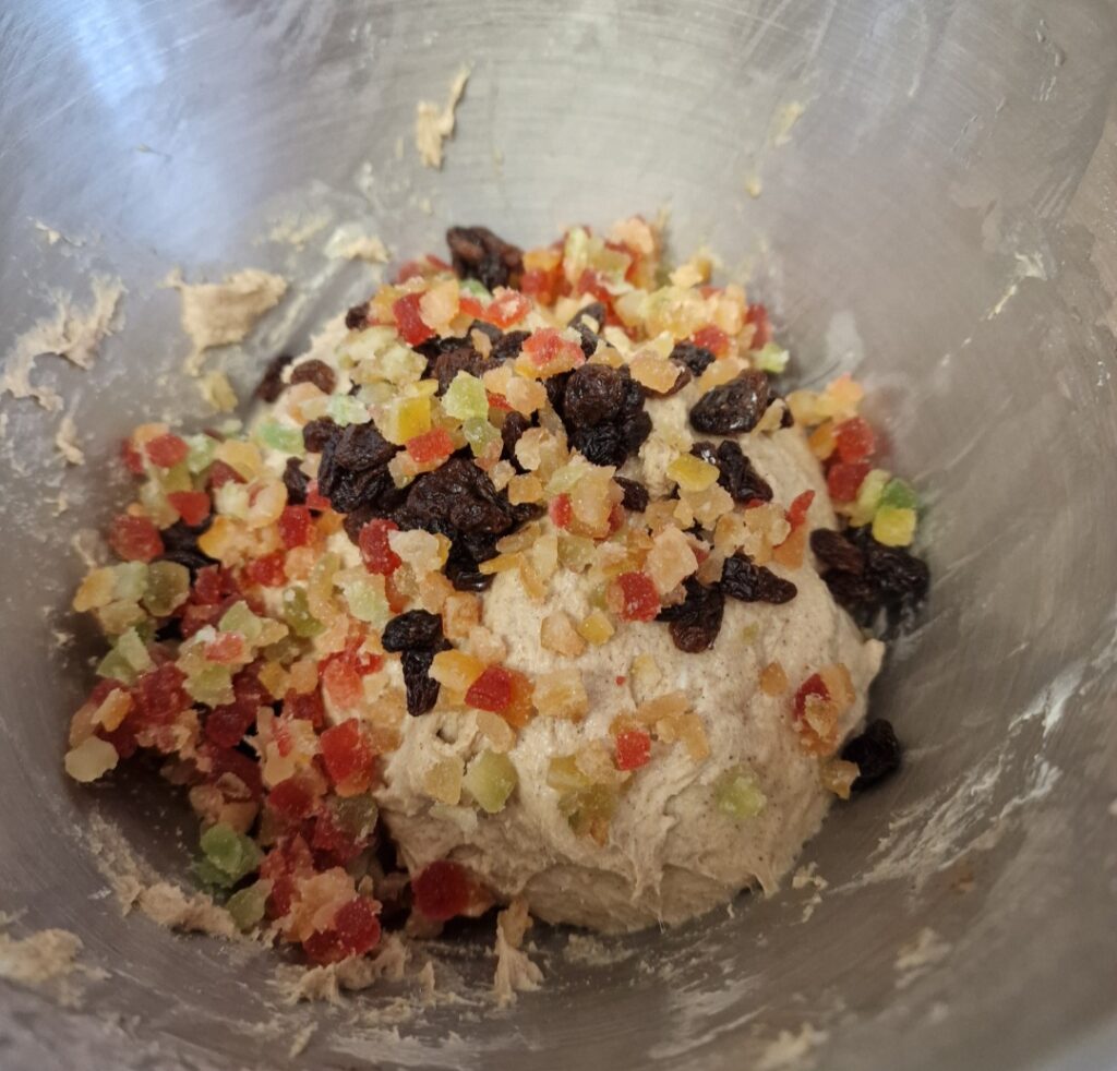 in der Knetmaschine 4 Minuten auf langsamer Stufe vermischen. Danach 4 Minuten auf schnellerer Stufe verkneten. Während 4 Minuten die kalte Margarine etappenweise unterkneten. Wenn die Margarine gut unter geknetet ist in einer Minute die Kandierten Früchte und Rosinen