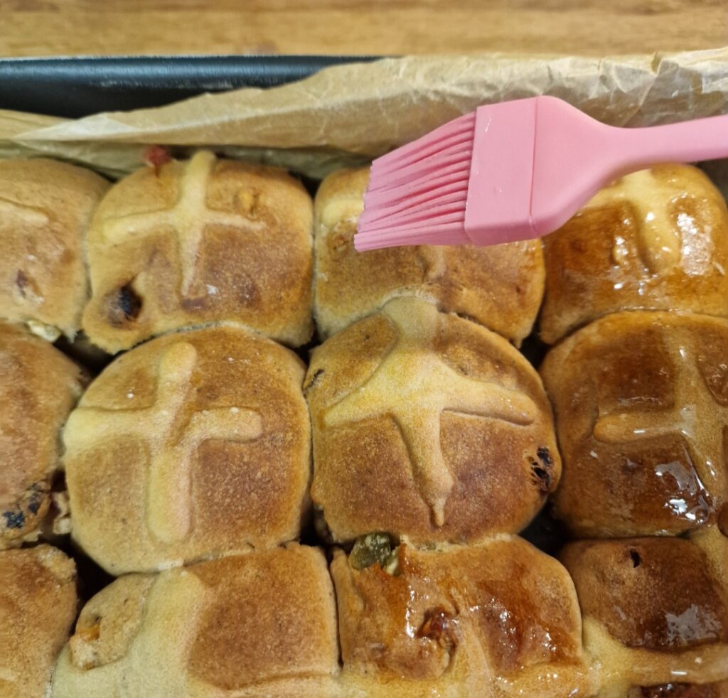 Die Hot Cross Buns aus dem Ofen nehmen und noch heiss mit der Glasur bepinseln.